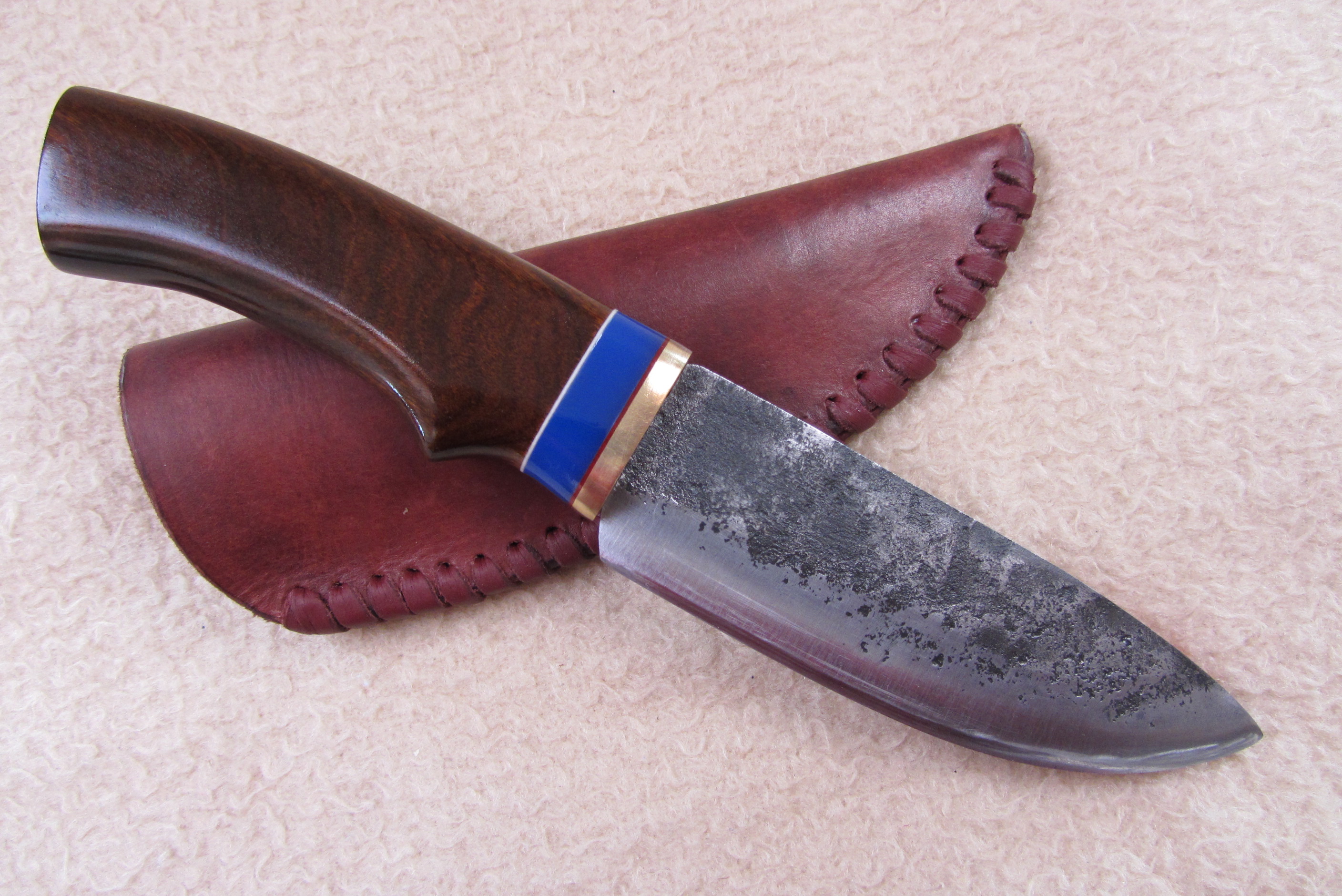 Das Ipeholz meines selbstgeschmiedeten Messers stammt aus dem Brennholzkasten meines Schmiedemeisters. Ipe wird z.B. für Terassenholz kultiviert.