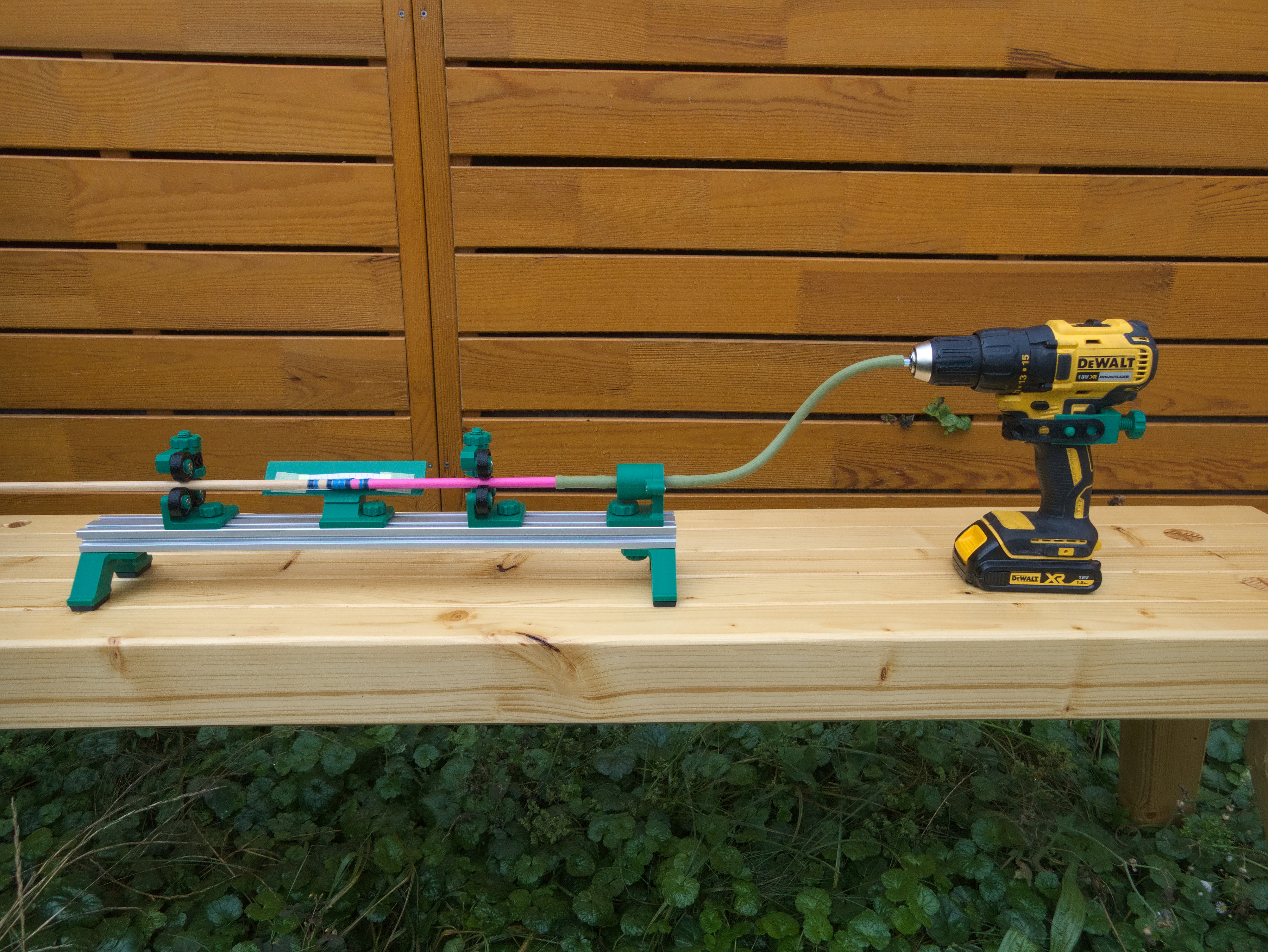 • Flexible Kraftübertragung mit fester Antriebswelle: Die Bohrmaschine ist über einen dicken Silikonschlauch mit der Welle verbunden, die in zwei Lagern läuft und den Pfeil dreht. So wird das Wackeln des Schlauchs nicht auf den Pfeil übertragen.