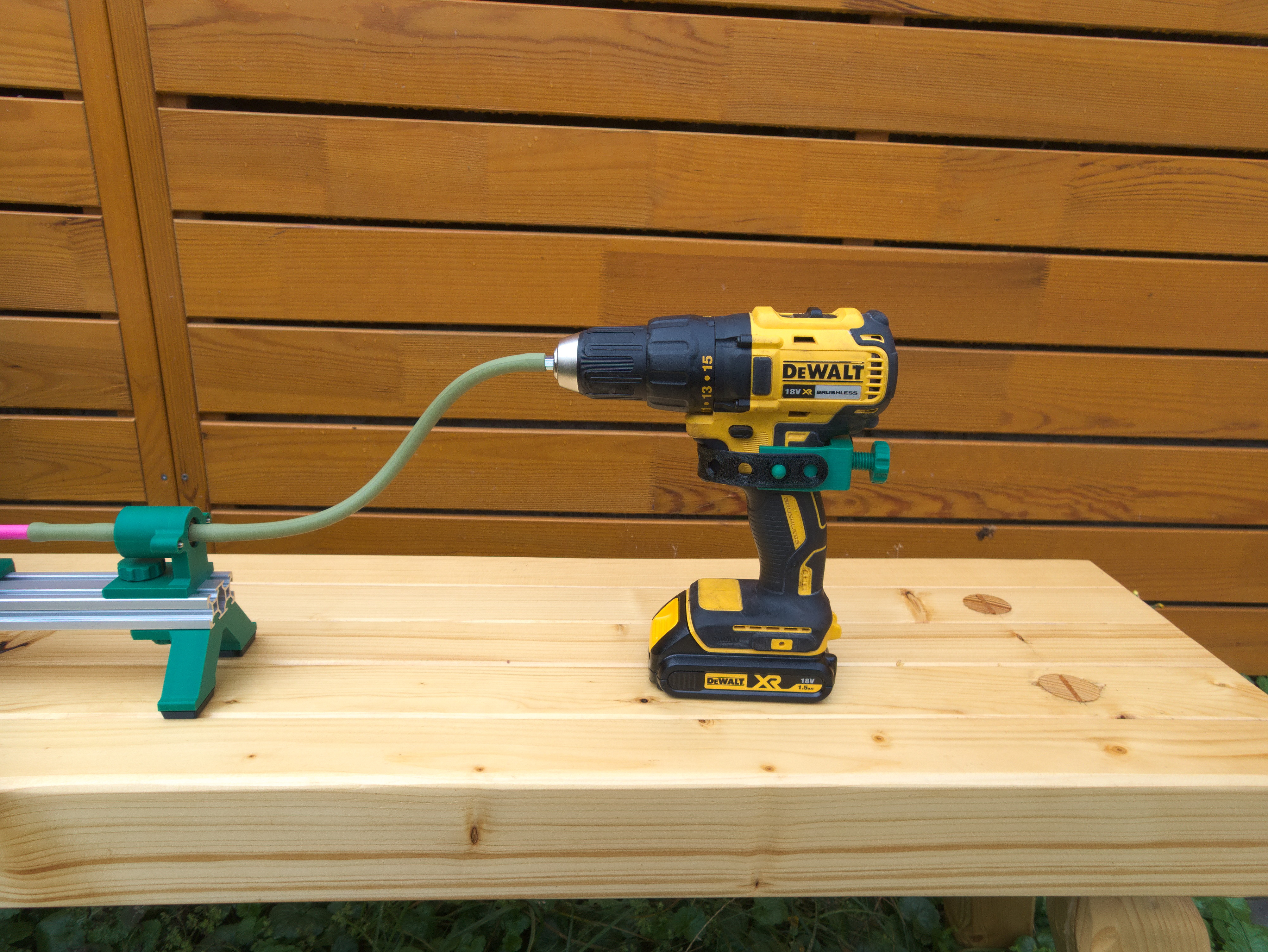 Denkbar wäre eine Halterung mit Manschette, die die Bohrmaschine hinter dem Bohrkopf greift, wie bei einem Bohrständer nur eben liegend, sodass die Rotationsachsen von Gerät und Bohrmaschine übereinstimmen.