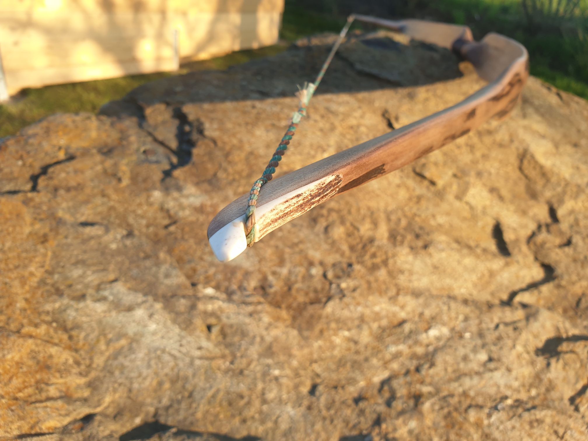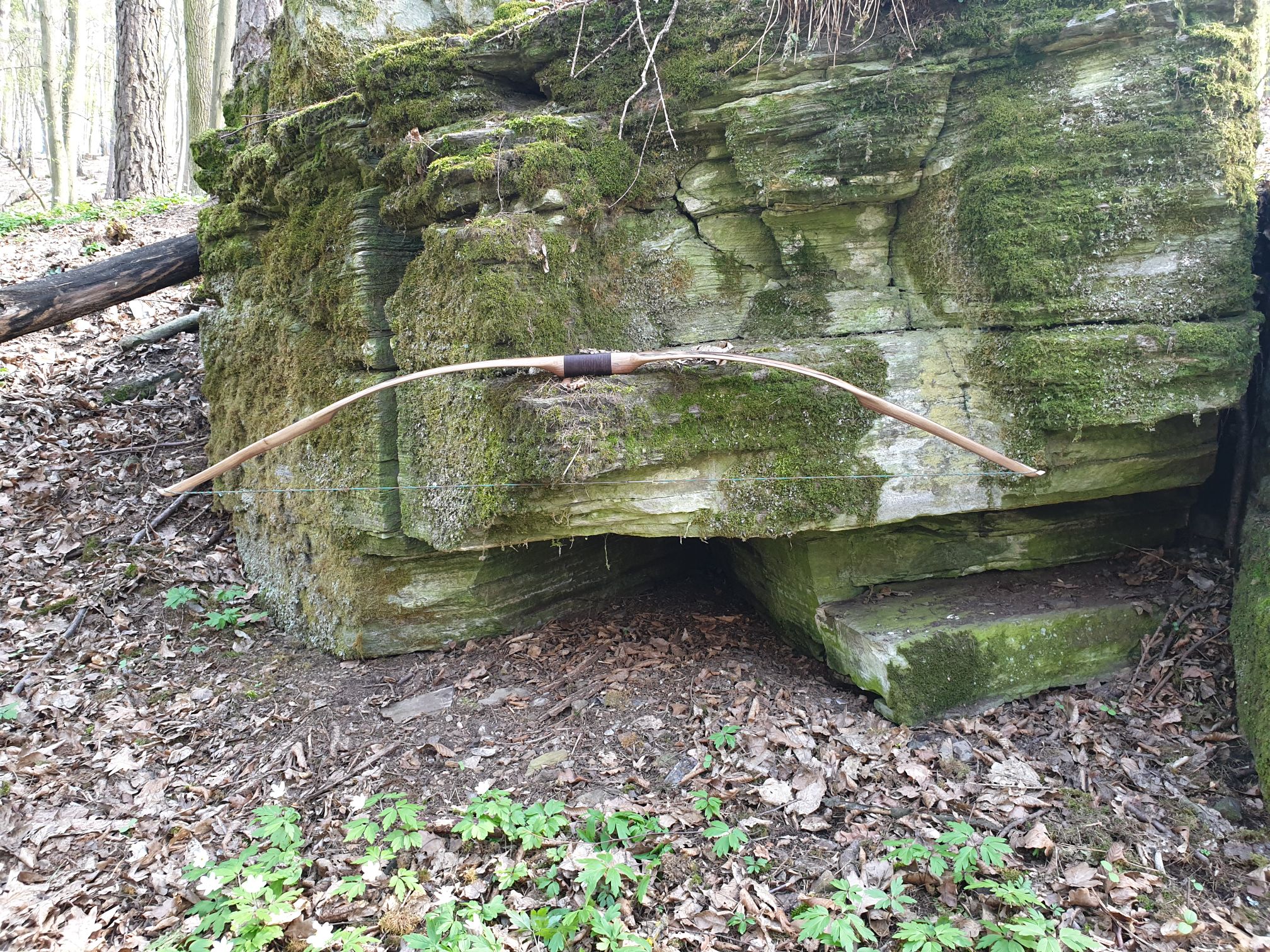 Hier kommt die Präsentation von einem Bogen auf den ich mich ganz besonders gefreut hab. Und zwar hab ich aus einem Stave Schwarznuss, den ich letztes Jahr einem Parcourbetreiber abgekauft habe, einen Mollegabet gebaut. Er ist im ganzen recht kurz und die Needles im Verhältnis ziemlich lang. Um ihn da etwas zu schonen hab ich dafür die Wurfarme extra breit gebaut. Wie bei Schwarznuss ja zu erwarten war hat er trotzdem recht viel Set bekommen. Die Geweihnocken und die Griffwicklung hab ich passend zum Bast gewählt. Zum ersten mal hab ich beide Wurfarme gleich lang gebaut. Somit ist der untere deutlich stärker.