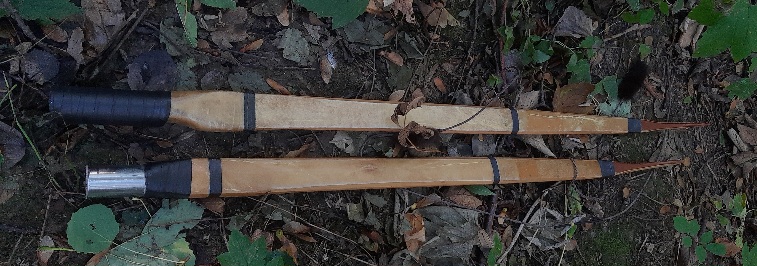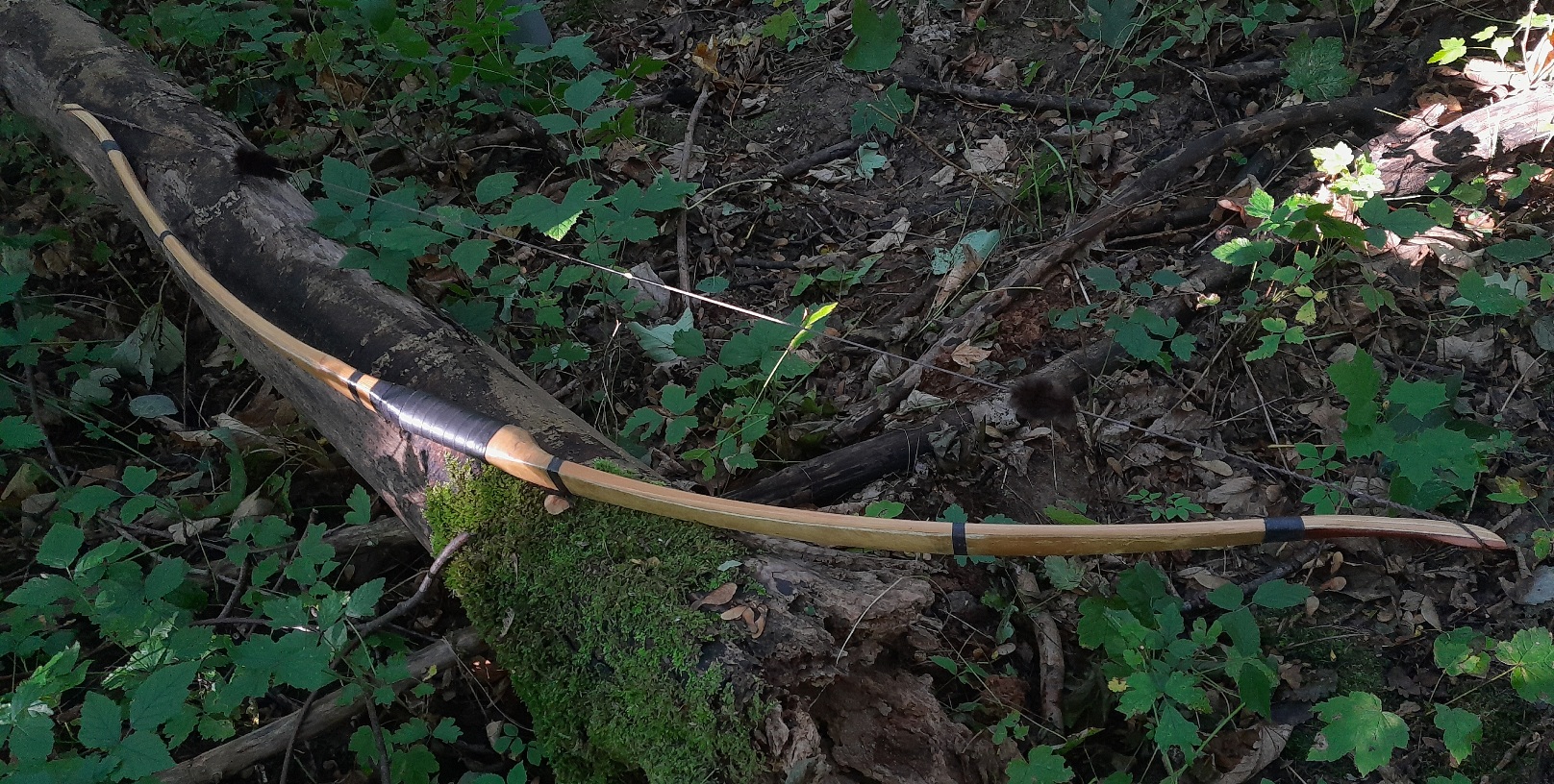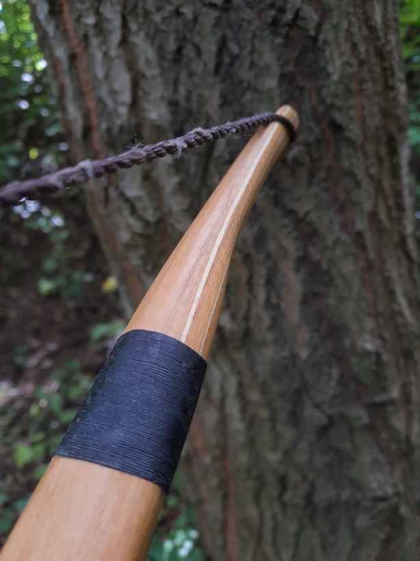 Da ein TD viel Extraarbeit macht und die Jahresringe nicht die dicksten sind, wurde ein Angstbacking aufgebracht, Rohhaut aus Hundekauknochen mit D3-Holzleim geklebt. Dann wurde ich übermütig: durch die aus Angst etwas dick gehaltenen Hülsen war der Griff recht breit. Um das zu kompensieren wollte ich den Bereich, in dem der Pfeil anliegt, etwas schmaler gestalten. Dabei war ich wohl etwas gierig, auf jeden Fall knackte es irgendwann. Das reparierte ich etwas halbherzig mit Holzleistchen und einer Manschette aus Rohhaut. Nicht besonders hübsch, aber es hielt und die Rohhaut ist ein gutes Material als Pfeilanlage.