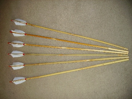 Die Pfeile bestehen aus Bambusstangen aus dem Baumarkt. Für die Selfnocks habe ich ein Stück von Bambus-Essstäbchen eingeklebt und diese mit rotem Sternzwirn gesichert.