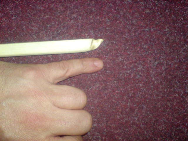 Habe wie schon im bogenbau beschrieben mal reste verarbeitet. Hasel. Der stamm war etwas kurz und mein bekannter hat leichte probleme mit hohen zuggewichten. Auch hat er geburtstag... Na bau ich ihm nen bogen. Das gute stück ist etwa 1.70m und hat 38 pfund zug bei 31 zoll auszug. Alles was zu sagen ist dazu ist der griff den ich mit einer kleinen pfeilauflage und nem handrückenschutz in form einer kleinen kerbe versah. Nur so. Sonst einfach bogen. Der tiller stimmt mich etwas verlegen. Aber leben kann ich damit. Er ist mit leinöl eingerieben. Na lange engländer bau ich lieber. Lach. Na dann... Gruß Reiko.