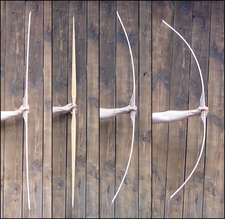 Was ich immer mache um den Tiller zu beurteilen, ist dass ich am bespannten Bogen entlang vom Griff aus in Richtung der Tips schaue. Da sehe ich jede Macke im Biegungsverlauf.