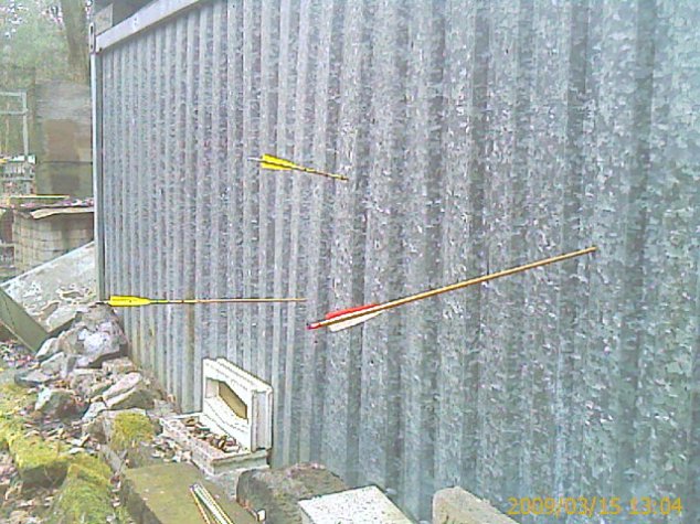 Wir haben z.B. mit 38 und 45 lbs Bögen auf 20 m geschossen und siehe das Ergebnis. Nur ein Pfeil ist zerbrochen, einige sind komplett in den Container reingeflogen, aber die meisten steckten. Dabei ist zu beachten dass der Container verzinkt ist ( hart )