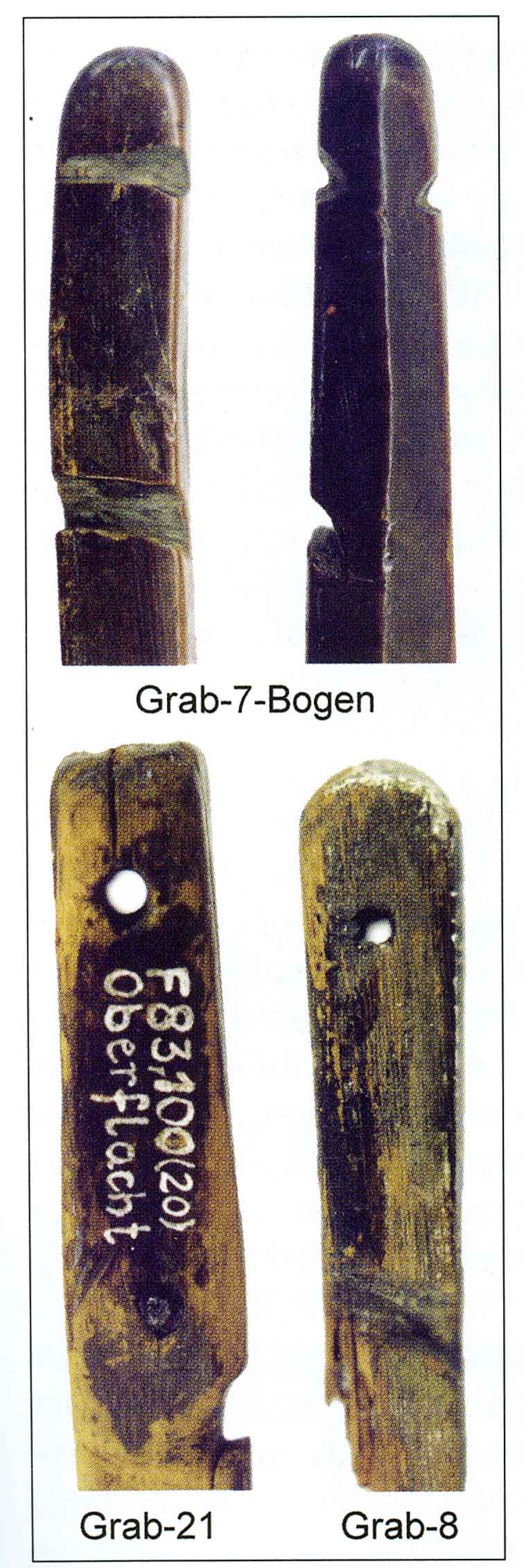In Oberflacht in Süddeutschland wurden dutzende Bögen in Gräbern gefunden, von denen leider nur noch drei erhalten sind. Die Bögen varieren um eine Länge von 170 cm .