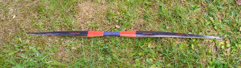 Holzart ist also Robinie, Länge 101cm. Der GRiff ist grade mal 12mm breit und 8cm lang. 3cm an der breitesten Stelle und 7mm an den Nocks. Ist ein vollpyramidales Design und wirft die kleinen Buchendübel sehr schnell, so macht das Spass. Und weil er auch cool ausschauen soll, ist er rot-schwarz bemalt mit dunkelblauem gewickelten Griff. Eine Pfeilauflage hat er nicht, denn wer nen coolen Bogen will, muss auch cool ohne Pfeilauflage schiessen