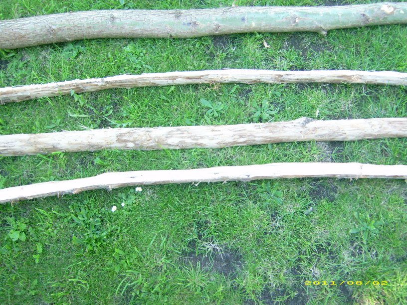 Die Ulme schaut ganz gut aus. Man müßte die Jahresringe sehen, um zu wissen ob sie sehr gut oder nur ein bissl gut ist. Aber gut ist sie auf jeden Fall. Ulme hat auch eine gewisse Festigkeit quer zur Faser - nicht so viel wie Hickory, aber immerhin. Man kann also auch aus leicht verdrehten Stücken getrost gerade Bögen bauen ohne daß diese brechen. Es kann allerdings sein, daß sie dann beim Tillern rumzicken, weil sie sich verdrehen. Außderdem muß man aufpassen, daß man nicht zu tief ins Holz schneidet. Das passiert sehr schnell, wenn die Faser nicht ganz gerade läuft.