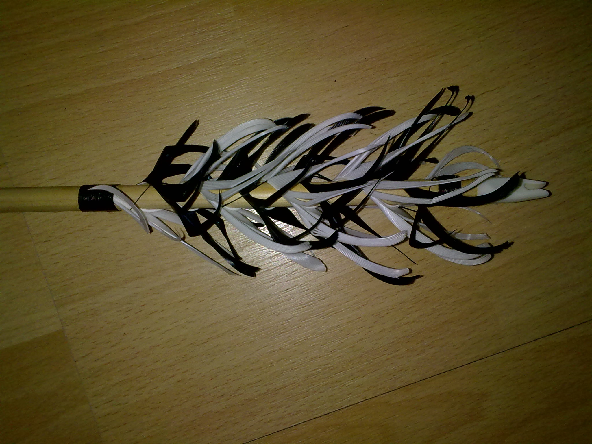 Ich weiß, die Plastiknocken sind ein Stilbruch aber die Schäfte sind nach dem Spinnen leider so dünn geworden daß ich mich nicht mehr getraut hab da einen Schlitz als Nocke reinzusägen. War bei grad mal 7,5mm