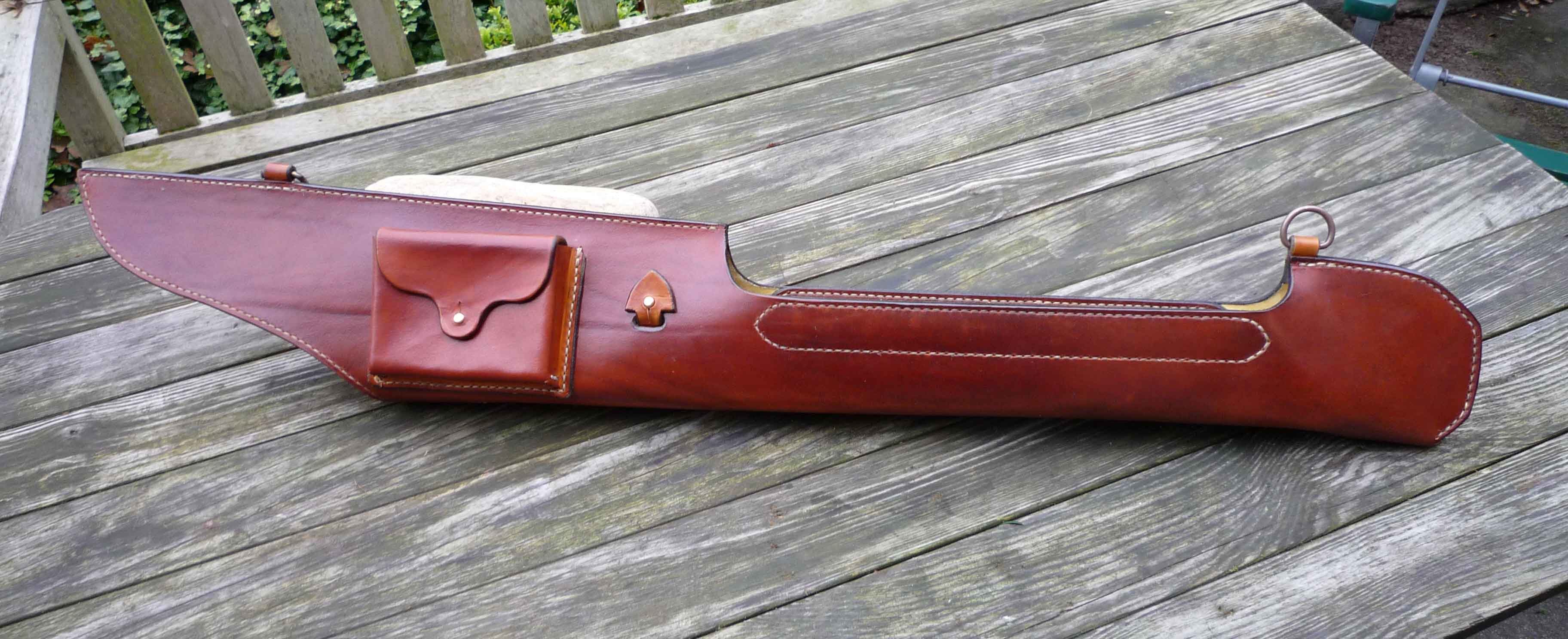 ich habe hier schon wunderschöne und sehr gut gemachte Lederarbeiten bewundert. Ich beschäftige mich in meiner Freizeit auch mit der Herstellung von ausgefallenem Leder-Zubehör für Bogenschützen. Nun will ich euch einfach mal meinen neuen Sidekick-Köcher "präsentieren"! Ich habe den Köcher mit einem sehr netten Bogenschützen entwickelt, der mir die besonderen Ansprüche eines Köchers- der für die Jagd geeignet sein sollte, erläuterte. Ich habe versucht, die sinnvollen Ideen in den Bau einfliessen zu lassen und es sind ein paar ganz interessante Geschichten dabei herausgekommen, die mir vorher garnicht so wichtig waren. So ist dieser Köcher mit einer Halterung für einen Aussenpfeil mit aufgeschraubter Broadhead-Spitze ausgerüstet. Zusätzlich habe ich eine sehr wirksame und von aussen einstellbare Pfeilsicherungslasche in den Köcher eingebaut. Diese sorgt beim Transport etc. für absolut sicheren Halt der Pfeile. Man kann den Köcher inkl.Pfeile nach unten halten und schütteln- die Pfeile bleiben da, wo sie hingehören! Die Sicherungslasche hat noch einen weiteren tollen Nebeneffekt...sie zieht in der engsten Einstellung die Befiederung unter den langen Lederüberhang des Köchers und schützt sie so vor Nässe und Regen. Und das Beste am Köcher- er trägt sich sehr angenehm!