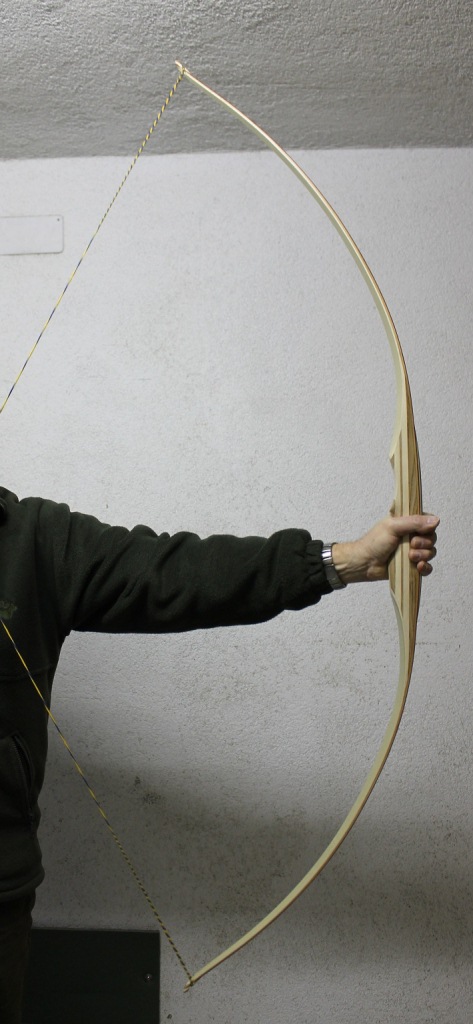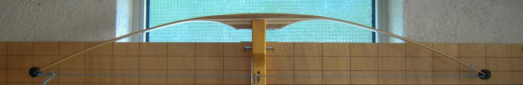 Da die Biegung der beiden bisher gebauten Bögen trotz Erhöhung des Gesamttapers von 0,2 auf 0,4 nicht ganz zufriedenstellend war habe ich dieses Mal die Form mit etwas weniger Deflex/Reflex geringfügig verändert. Alle anderen Maße habe ich in etwa beibehalten. Und siehe da, er biegt sich schon recht gut. Für den perfekten Tiller brauche ich aber wahrscheinlich noch etwas mehr Übung od. Geduld bei der Ausarbeitung.