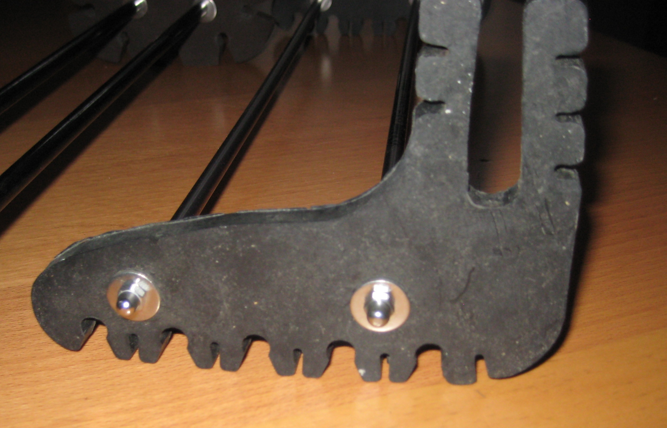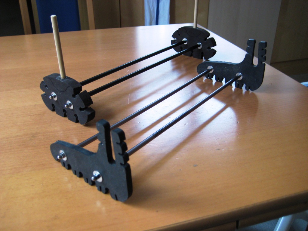 Die Abstandshalter bestehen aus Gewindestäben M4, einmal ( Hartgummi ) überzogen mit einem alten Alupfeil, beim anderen ( Schaumstoff ) mit Carbonrohr aus dem Drachenbau.