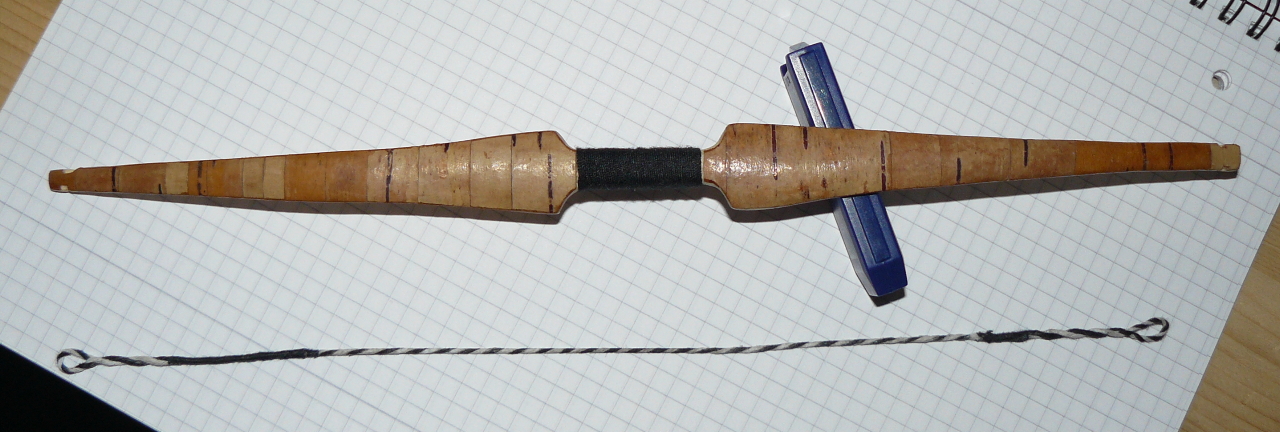 Das Böglein misst von Nock zu Nock 16cm. Bevor ich mich entschied, das "Ensemble" an den Innenspiegel meines Autos zu hängen, konnte er unglaubliche 11,8m schießen!Allerdings waren er nach dem 5. Schuss leider ein paar Fasern am Rücken aufgestanden, deswegen musste er hängen...