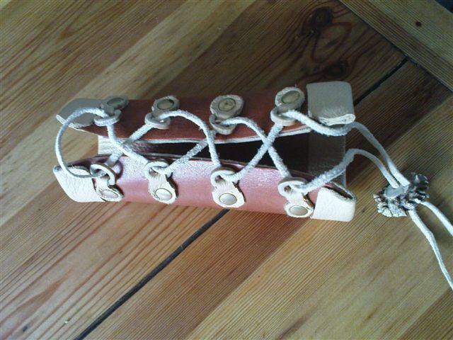 Eine Alternative zu den Metallhakenösen und wenn's bissl mehr traditionell sein soll ist die "Schnellschnürung" mit Ringen aus Hirschhorn. Die müssen allerdings angenäht werden. Dazu sägt man Scheiben aus dem Gehörn eines Hirsches (oder Rehbocks)in dem gewünschten Umfang, entfernt das Mark (schön ausschmirgeln) und näht diese entstandenen Ringe an den Armschutz. Dann kann man das Lederband wie bei geschnürten Boots durchziehen (über Kreuz). So muss man nur in den Armschutz hineinschlüpfen, zieht unten an den verbleibenden Lederbändern und schon ist das Ding zu und passend