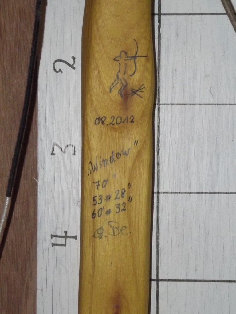 Durch einen snaky geformten "Schlenker im Holz ziemlich genau in der mitte war schon von vornherein klar, daß dieser als Langbogen mit steifen Griff und natürlichem Schußfenster (FAST schon ein Centershot) gebaut werden wollte.