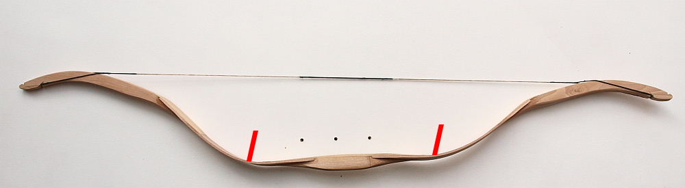 Immer wieder liest man, das der Holzkern keine so große Rolle spielt, weil er in der Mitte liegt. Das ist nicht richtig. Bei Verwendung von rund 3 mm Sehnenschicht, 5 mm Holz und 4-6 mm Horn liegt der Holzkern näher am Rücken und da das Holz mehr als ein Drittel der Schichtdicke ausmacht, ist es auch relevant. Zudem: 5 mm Ahorn oder 5 mm Osage als Holzrahmen sind schon ein gewaltiger Unterschied in der Leistung.