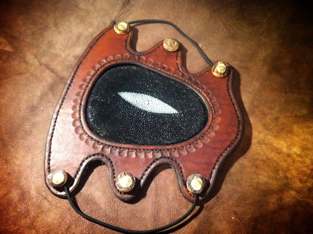 Hatte Rochenleder nur einmal in der Hand, aber das fühlte sich sehr stabil an. Die Sehne dürfte an den glatten, perlenartigen Schuppen gut gleiten. Sie könnte aber an der Vorderkante des Ausschnittes hängen bleiben, oder?