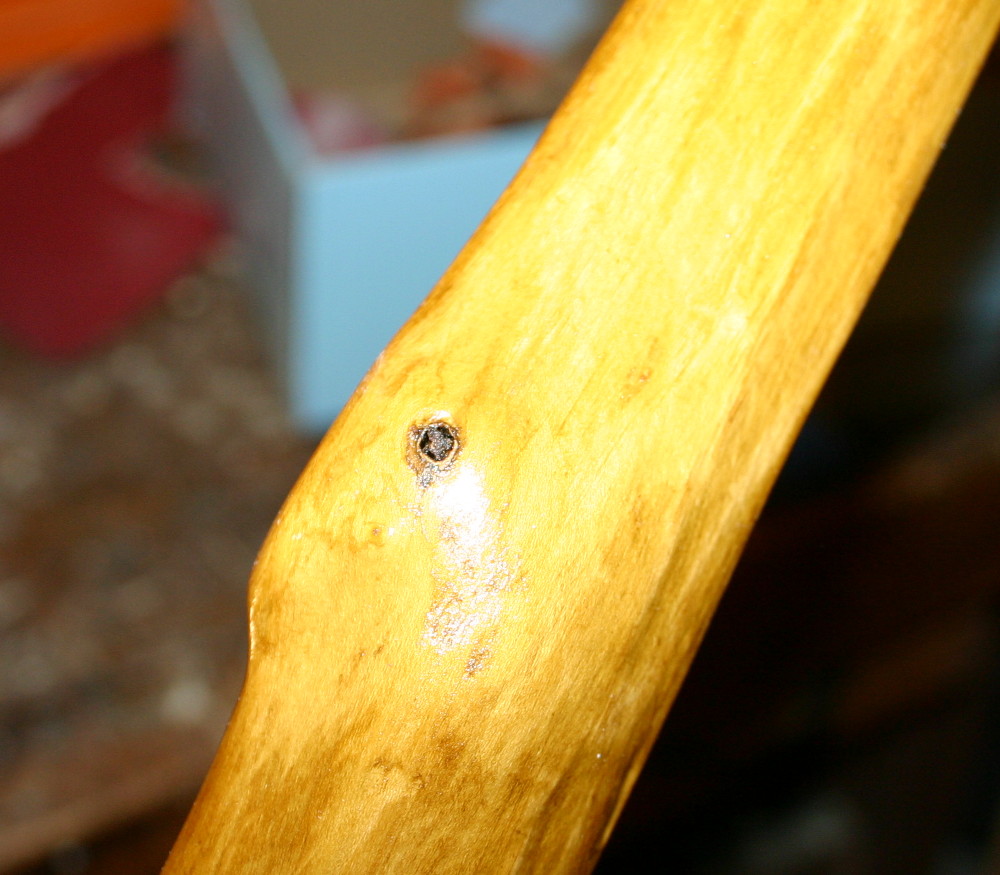 Nachdem das Holz einigermaßen trocken ist, habe ich beim ersten Stab (dem auf dem "Gruppenbild" ganz rechts) die Form herausgearbeitet. Er ist leicht snaky, leicht seitlich verzogen und hat sich auch noch wieder etwas verdreht..: