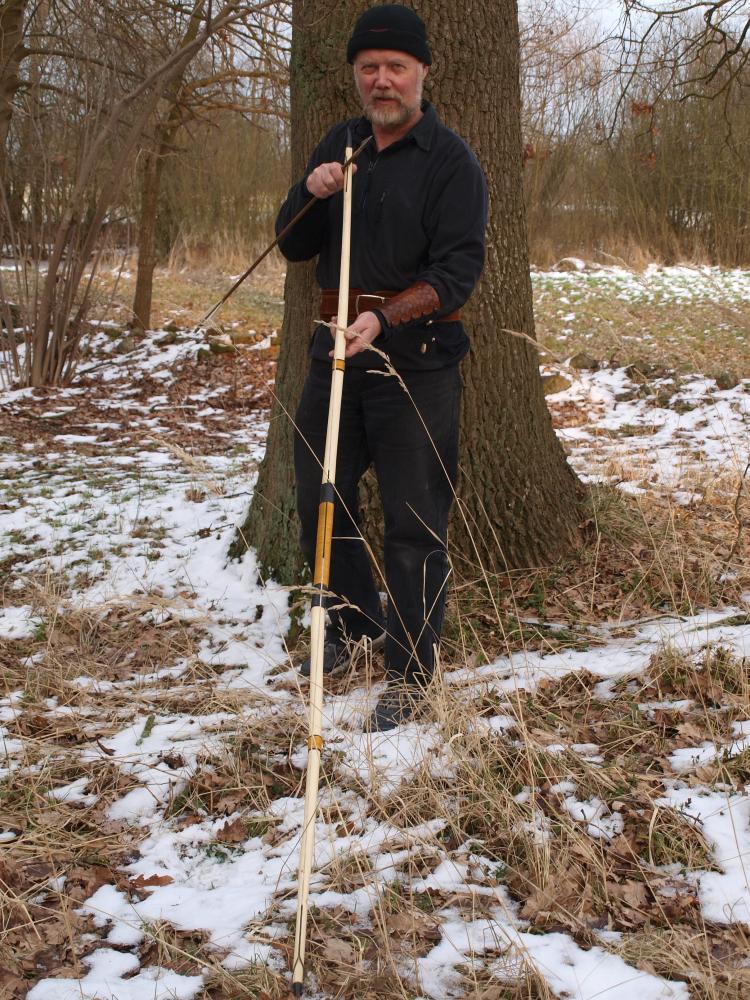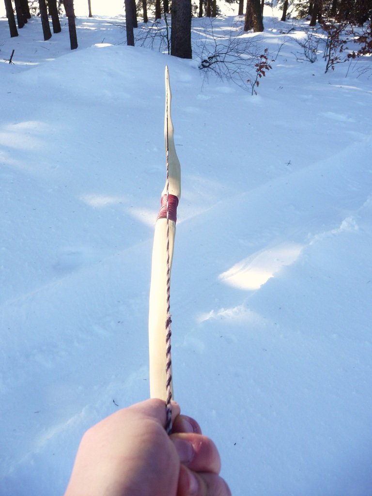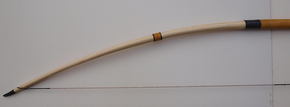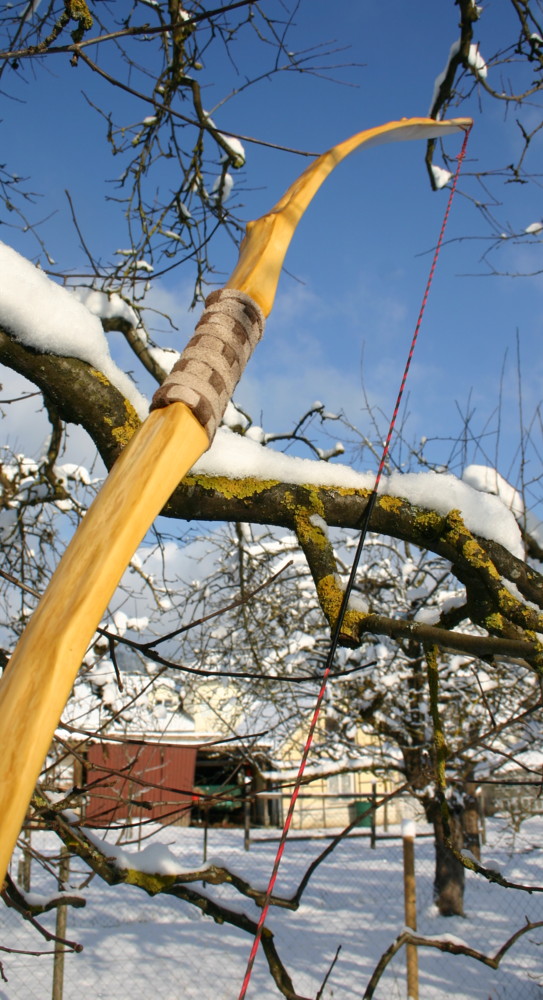 In meiner Jugend hatte ich mal einen Holunderbogen aus einem Zweig mit Rinde, der so als Stock ganz wunderbar geschossen hatte, allerding auch eher 8 denn 10 lb hatte. Aber sowas wollte ich mal ausprobieren, sozusagen ein Sapling in Reinkultur: Zwei Äste, nur die Rinde ab, zu den Enden ein wenig konisch hin geschnitzt, im Griff verleimt, Sehne dran, fertig. Natürlich mußte er dann für die Präsi doch noch aufwändig geschliffen und gebohnert werden und bekam auch eine yumi-mäßige Wicklung an den Griff.