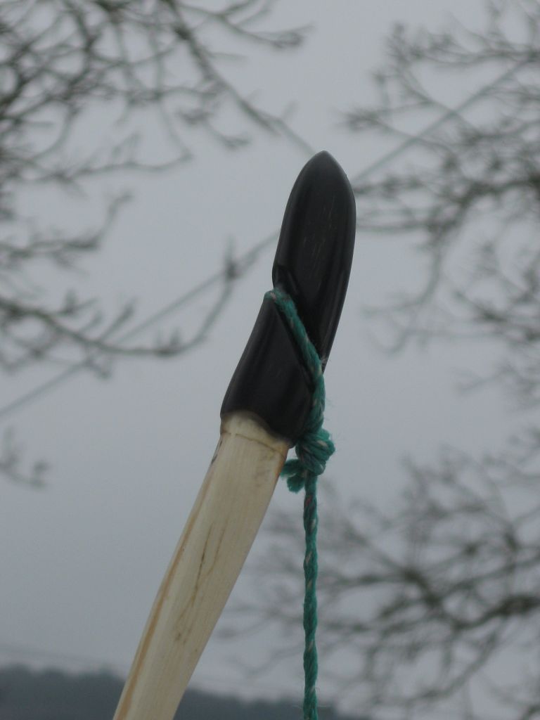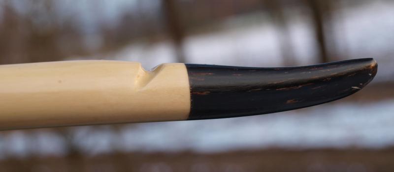 Die Nocke aus schwarzem Büffelhorn ist mit einem dübelartigen Fortsatz in den Markkannal geklebt. Die Sehnenkerbe liegt somit auf Holz und Horn.