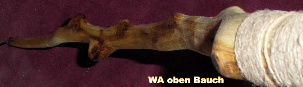 Natürlich habe ich für den Wettbewerb mehr auf Sicherheit gebaut. Nach Abschluss der Competition werde ich den Bogen brutal kürzen und komme dann sicher über 40 lb. Ich möchte mal sehen, was das Holz aushält. Alle Knubbel und Astansätze sind übrigens plan geschliffen