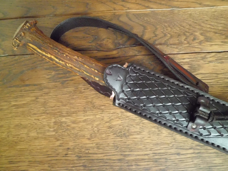 Der Pfeilsucher ist mit einem Hirschhorngriff versehen und hat eine Handgeschmiedete Parrierstange.