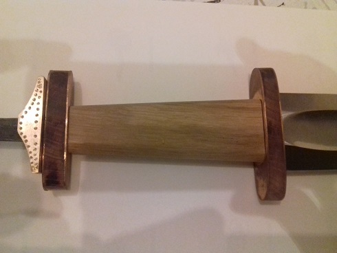 Die Vladimir Klinge läuft ihrer Fertigestellung entgegen, hat Bronze.- und Pflaumeplatten sowie einen Handgriff aus Eiche. Die Pommel ist aus Bronze mit einfachen Verzierungen.