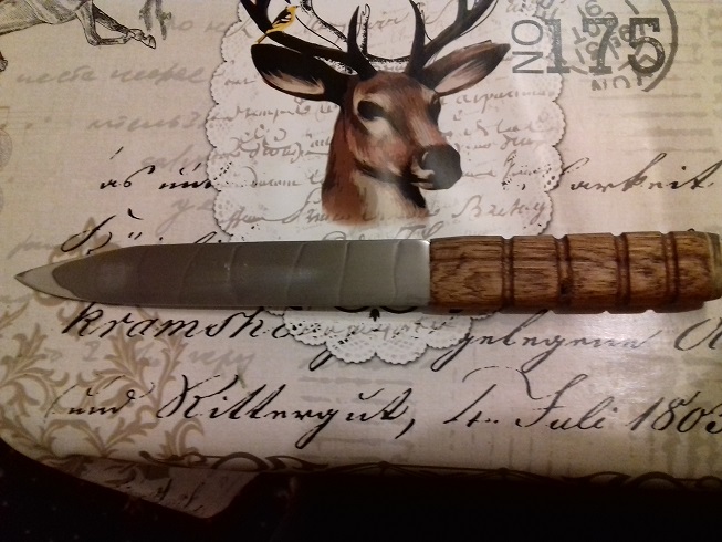Sax mit Handgriff aus Eiche und Hirschorn als Endkappe, Kohlenstoffklinge.Die Lederescheide wird noch mit zwei Ygdrasil Bäumen und mehreren Bronzenägel verziert.