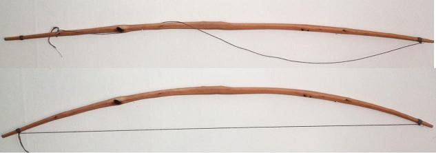 So, ist zwar kein Flitzebagen, nur ein asymmetrischer Langbogen, unten die Sehne in einer Kerbe am Bogenbauch fixiert und dann Schweinerückenknoten 4x, oben einseitige Sehnenkerbe seitlich und am Bogenbauch mit zu ziehender Schlinge, aber