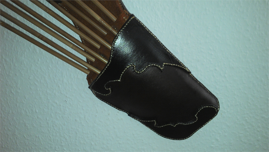 Das punzierte Muster kommt leider nicht so zur Geltung wie ich es gehofft habe (ich hätte mehr das Motiv als den Hintergrund punzieren sollen) . Mit Farbe trau ich mich aber nicht richtig ran. Die Dreieraufteilung für die Pfeile habe ich aus verschiedenen Köchern hier im Forum abgekupfert, fand ich einfach super. An dem Zipfel kann man noch einen Pfeilreiniger befestigen