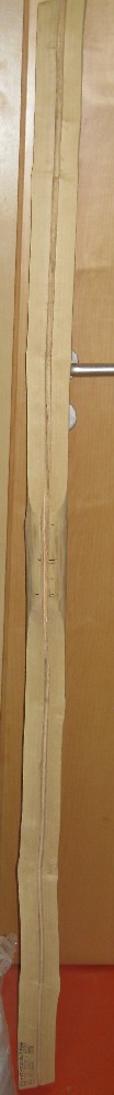geschnitten am 17.12.2012, Gewicht nach dem groben Zuschneiden 2856g, heute nur noch 1850g und 12% Restfeuchte. 55mm gewachsener Deflex, leichter Drehwuchs, ansonsten kerzengerade, Länge 156cm, Breite zwischen 54 und 64mm, habe noch keine genaue Vorstellung vom Design, ausser, dass ich ihm wg. der Kürze kurze Recurves verpassen will, der Rest wird sich dann ergeben, geplantes Zuggewicht 50# +-5#