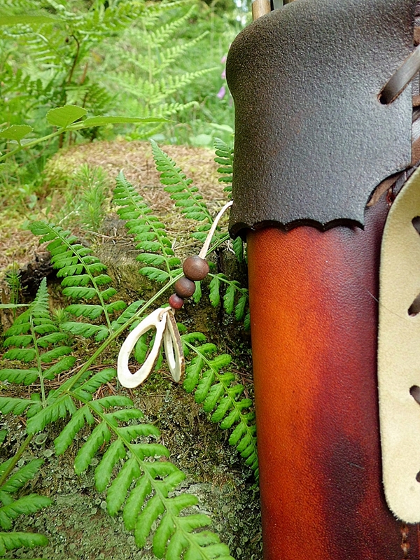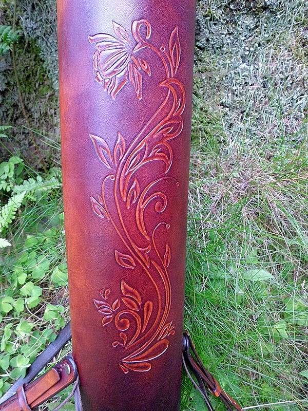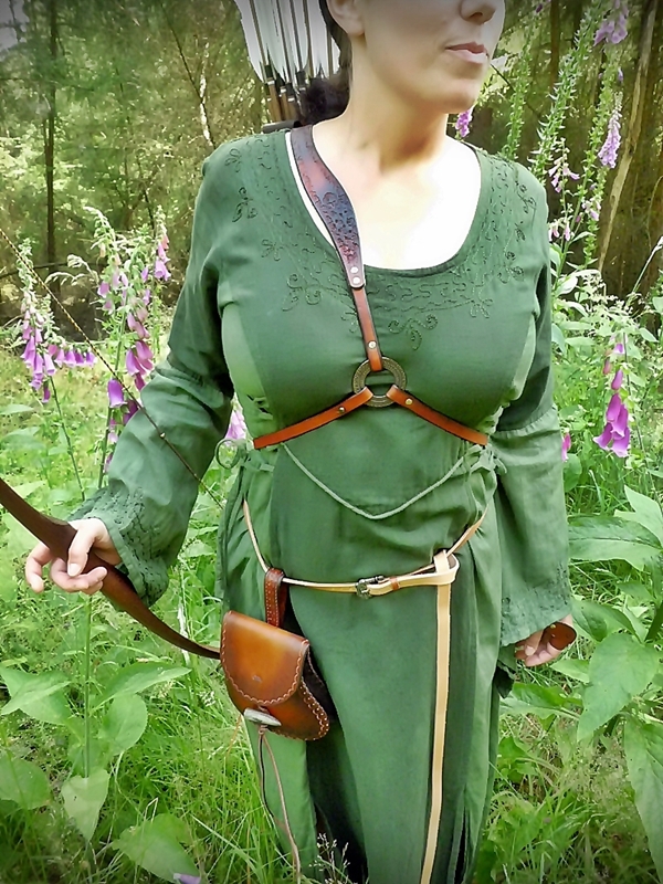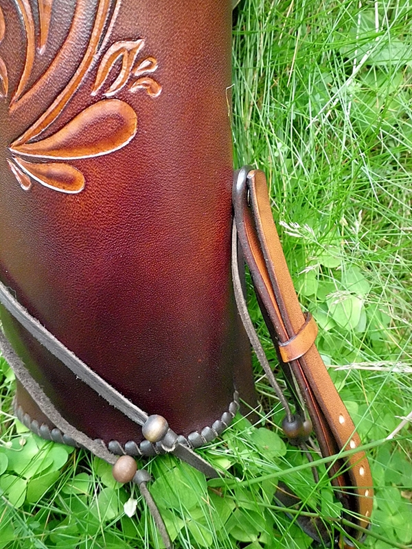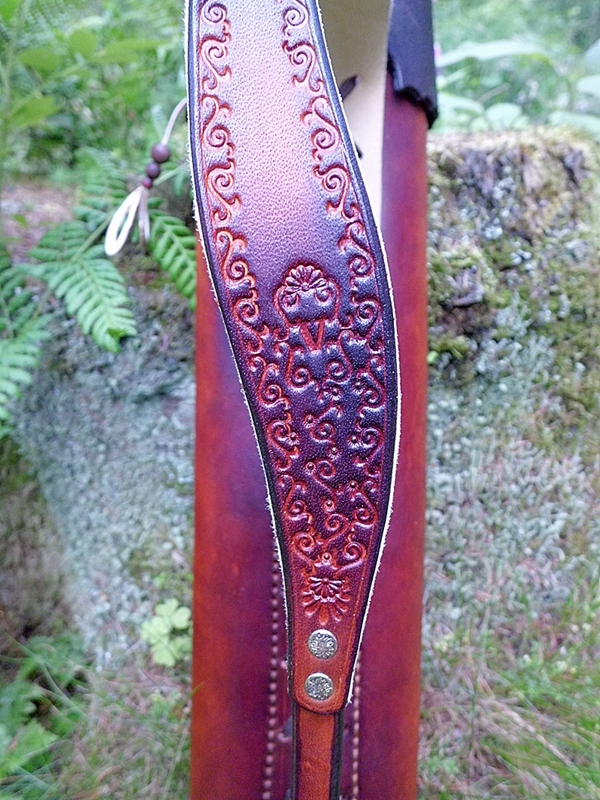 Dieser Rückenköcher mit Dreipunkt-Gurt-System ist aus pflanzlich gegerbtem Leder. Der Gurt ist innen mit Bekleidungsleder leicht gepolstert, sodass seine 581 Gramm Reingewicht für die Trägerin auch im Sommer nicht zur "Last" werden.