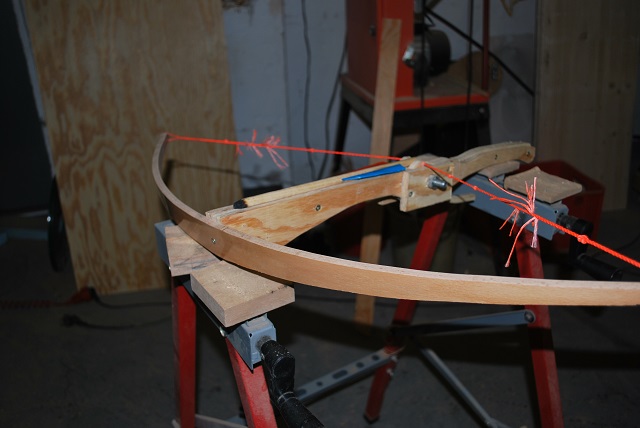 Der Bogen ist ein Stück Lattenrost, scheinbar massiv Buche, gespannt etwa 80cm lang. Die Säule besteht aus drei Lagen Sperrholz, ebenso die Nuss und der Abzug. Die Nussrast war easy durch den dreilagigen Aufbau...