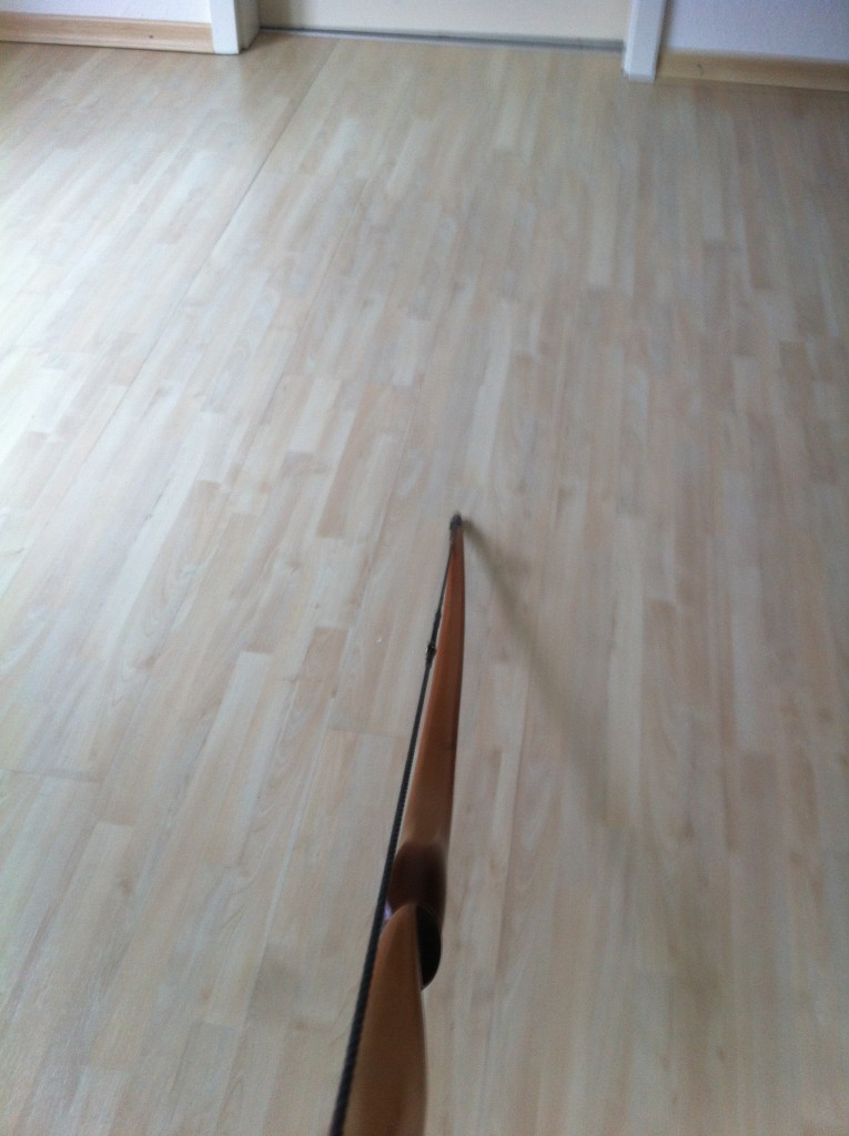 So, wie die Sehne locker auf dem Bild liegt, scheint sie mir aber auch zu lang zu sein. Nur mal so als groben Anhaltspunkt, die Standhöhe sollte ungefähr 16cm betragen. Dh. im aufgespannten Zustand sollte eine Faust mit ausgestrecktem Daumen zwischen Griff und Sehne passen. Kommt das in etwa hin?