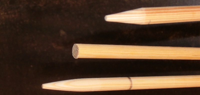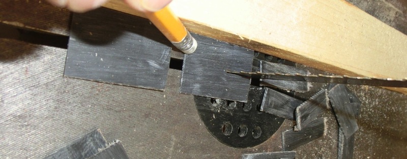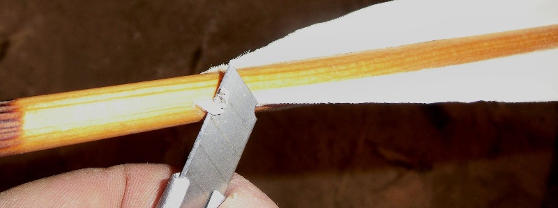 Zuerst einmal die benötigten Schäfte zusammensuchen und sortieren. Wenn man gleich eine größere Menge an Schäften bearbeitet, dann lohnt sich wenigstens der ganze Maschinenpark. Die Schäfte werden nach Spine, Gewicht und Länge zu verschiedene Gruppen zusammen gestellt. Dann wird die Tiefe des Einschnittes am hinteren Ende, und dessen Lage markiert. Die Hornplatten für die Inlays müssen leicht plangeschliffen werden. Dazu klebe ich sie mit doppelseitigem Klebeband auf ein Rum-Fort-Brett und gehe mit dem Bandschleifer einmal drüber, nur soviel das die groben Riefen und Sägespuren beseitigt sind. Danach werden die Hornplatten erst halbiert, und dann noch mal der Länge nach geteilt. Aus dicken Hornplatten werden Keile für Flightpfeile geschliffen. Schon etwas zu spitz um sie bequem im Schaft einzupassen. Die Spitzen werden wieder auf Sägeblattdicke „stumpfgeschliffen“, passend für den Keilausschnitt im Schaft. Die Pfeilschäfte werden mit der Bandsäge geschlitzt. Und mit einer Schlüsselfeile wird der Schlitz an die Horninlays angepasst. Sie werden dann mit einen Epoxid eingeklebt, eine Wäscheklammer kann helfen.