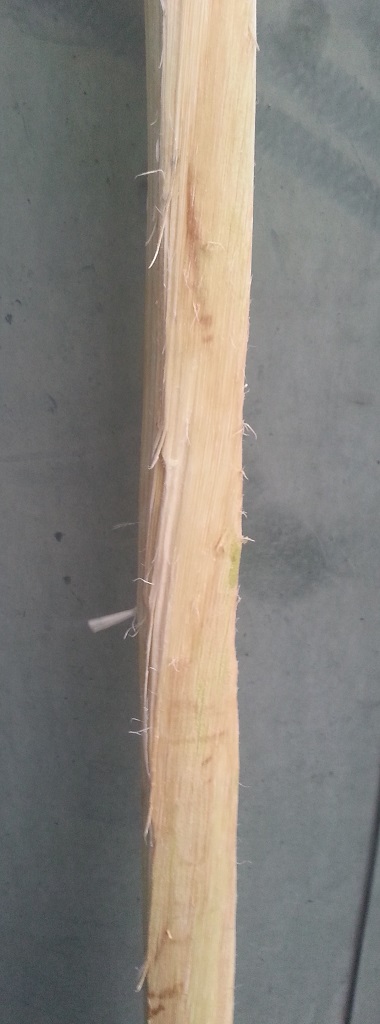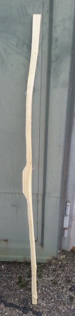 Dann die Wurfarme von 3cm am Griff auf (noch) 1,5-1,2 cm runtergearbeitet, den Griff ein wenig in Form gebracht und die Rinde mit dem Spchtel runter gekratzt. Dabei hat sich leider ein Span vom Rücken gelöst und ich durfte feststellen, dass ich wieder einmal Drehwuchs habe.