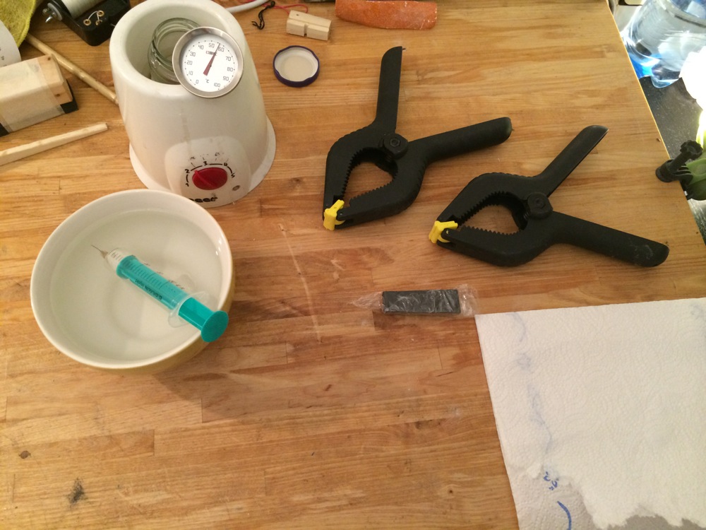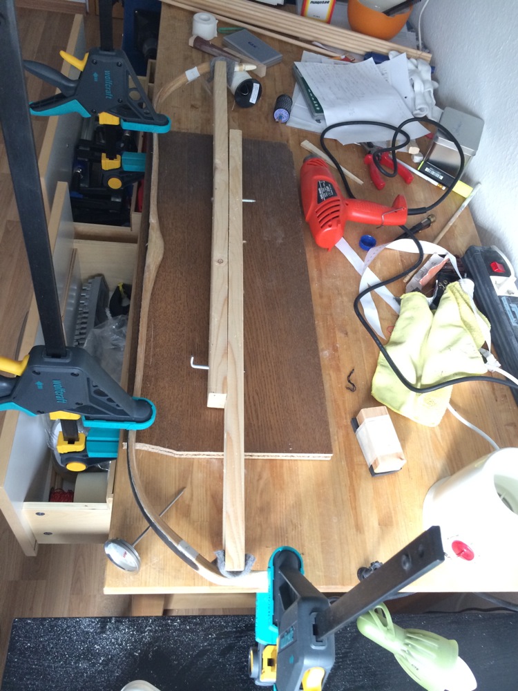 2) Gespannten Bogen an einer Tischkante befestigen, so dass die zu begradigende Stelle frei schwebt, und eine teils gefüllte Wasserflasche über Nacht dranhängen;