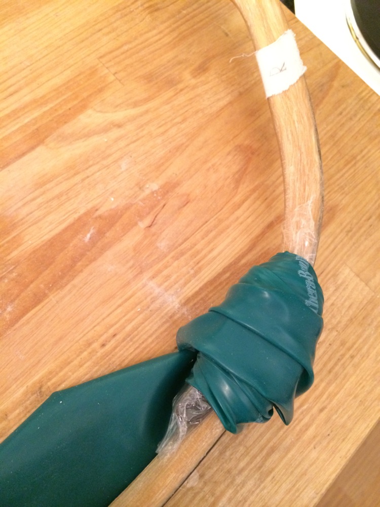 Ich ent-twiste den Bogen immer noch. Im Prinzip muss ich den rechten Kasan von mir wegdrücken und den linken zu mir herdrehen, damit die Sehne beide Kasans sauber mittig durchläuft. Der Bogen ist also ein kleiner Propeller.