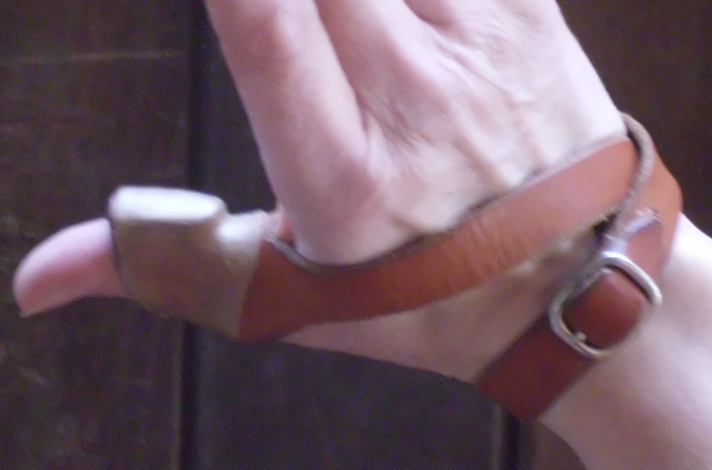 Wenn ich den Pfeil einlege, sitzt die Sehne noch nah am Zeigefinger-Grundgelenk: Wenn ich jetzt aber ausziehe, dann wandert der Berührungspunkt der Sehne am Zeigefinger nach vorn, weil mein Ungar viel kürzer ist als ein Yumi: Und hier muß ich dann aufpassen, daß ich beim Drehen der Pfeilhand noch im Auszug nicht aus Versehen seitlichen Druck mit dem Zeigefinger auf den Pfeil ausübe. Dann verbiegt sich nämlich mein Pfeil und scheppert im Abflug gegen den Bogen.