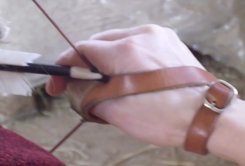 Und jetzt eine Zeit lang versucht, etwas tiefer zu greifen, sodaß das ganze Pfeilende am unteren Rand vom Zeigefinger mitgestützt wird, so wie es die saubere Rinne Deines Handschuhs zeigt.