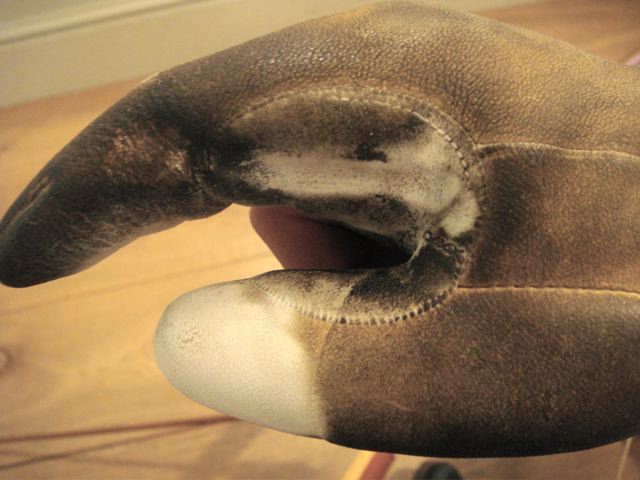 Und auf meinem schmuddeligen Handschuh (sorry) auch recht gut zu sehen ist der Punkt wo beim Eindrehen Druck auf den Pfeil kommt. Da ist eine regelrechte Bahn eingearbeitet. Ich wende da durchaus Kraft auf - aber halt nur hinten.