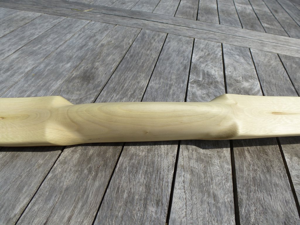 Der Ast war 210cm lang und hatte einen Durchmesser von 6 -> 4,5cm. Rinde und Bast kamen sofort runter und ich habe grob den Flachbogen rausgearbeitet und ihn erst draußen und dann drinnen trocknen lassen. Der Markkanal geht durch den Griff und zum Glück ist er dort nicht gerissen und Drehwuchs / Verzug hat er auch nicht gezeigt. Nach 2 Wochen habe ich den Rohling gekürzt, den Griff weiter ausgearbeitet und die Seiten schon mal pyramidal geschnitten. Nach 4 Wochen habe ich dann angefangen zu tillern.