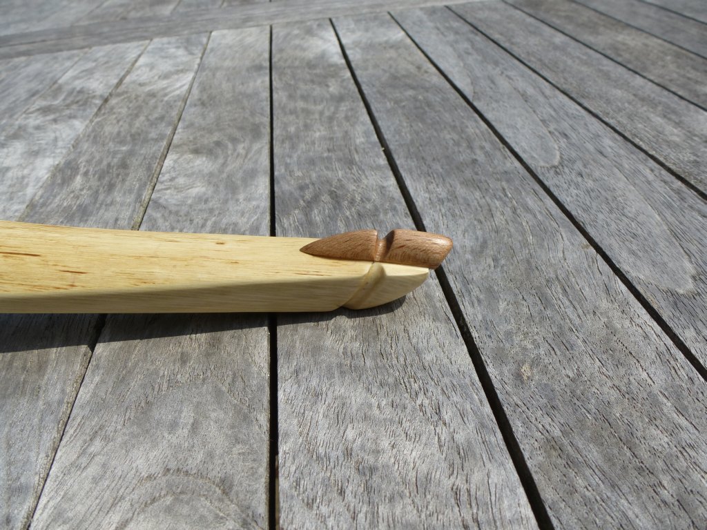 Der oWa ist erst deflex und nach einem Knick reflex, der uWa ist reflex. Der oWa ist 4cm länger und bleibt etwas länger breiter. Den Griff habe ich versucht kurz zu halten und nicht mehr so klobig wie beim ersten Versuch, als Overlay habe ich kleine Stücke Buche genommen.