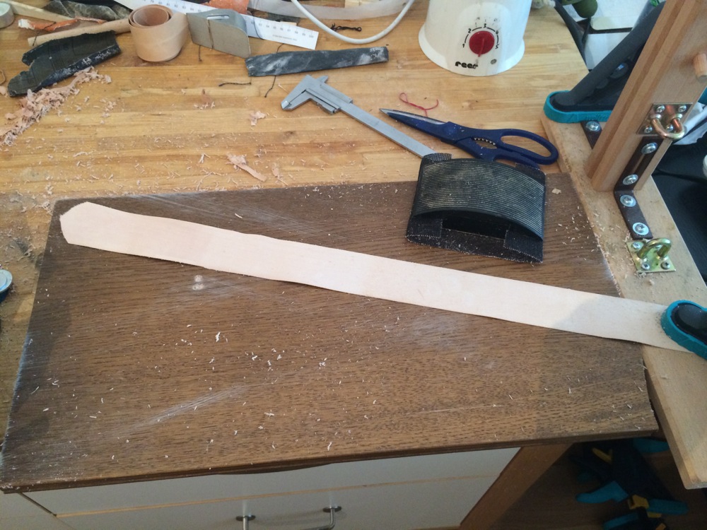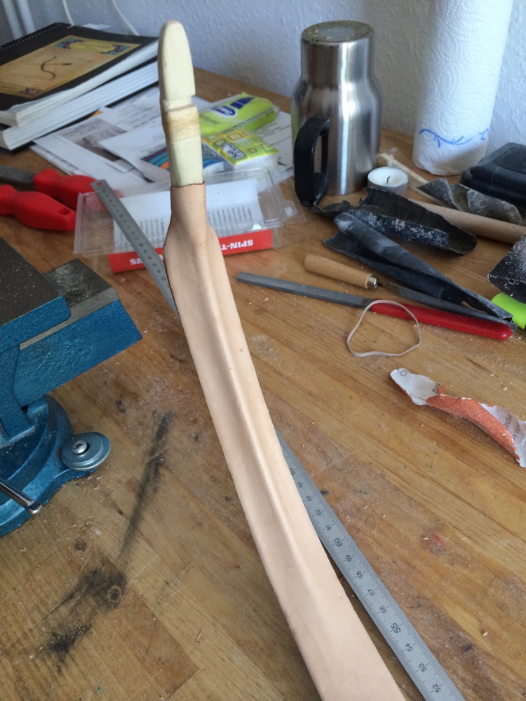 ich bin Euch ein paar Fotos vom Bekleben mit dem Leder schuldig! Lessons learned bei der Aktion: 0,7mm ist selbst nach hobeln und schleifen eigentlich immer noch zu dick. 0,4-0,5mm Ausgangsmaterial wären super. Habe ich aber nicht auftreiben können. Aber wohl ein Vorteil: Dieses Leder gleicht die kleinen Unebenheiten in der Sehnenschicht sehr wohlwollend aus.