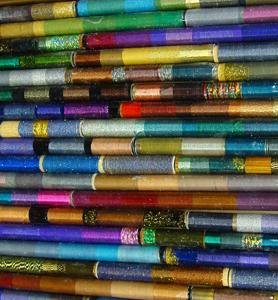 Ich häng' hier mal ein Bild von Wicklungs-Musterstücken an, da sind zweifarbige Wicklungen dabei und ein paar aus mehrfarbigem Garn.