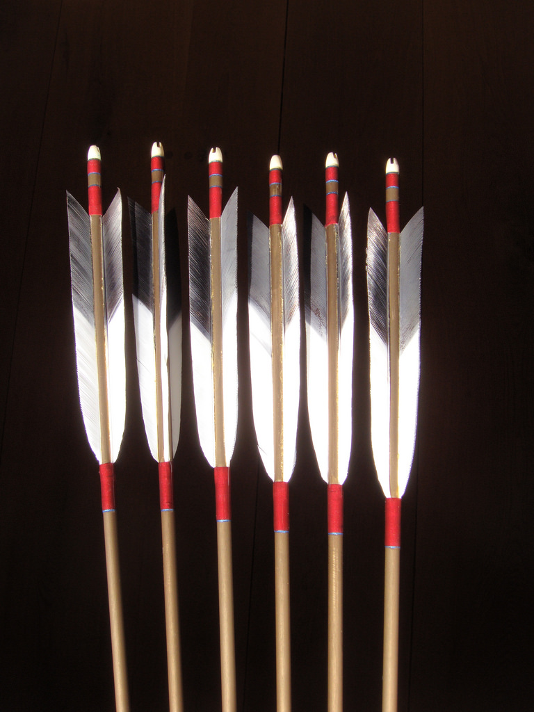 Und die Hauptarbeit ist da auch im Richten und Schleifen der Schäfte, nicht im Lack. Man hat das sicher auch mit Kriegspfeilen gemacht, und man hat nach Gewicht sortiert und nach Knoten-Aufteilung.