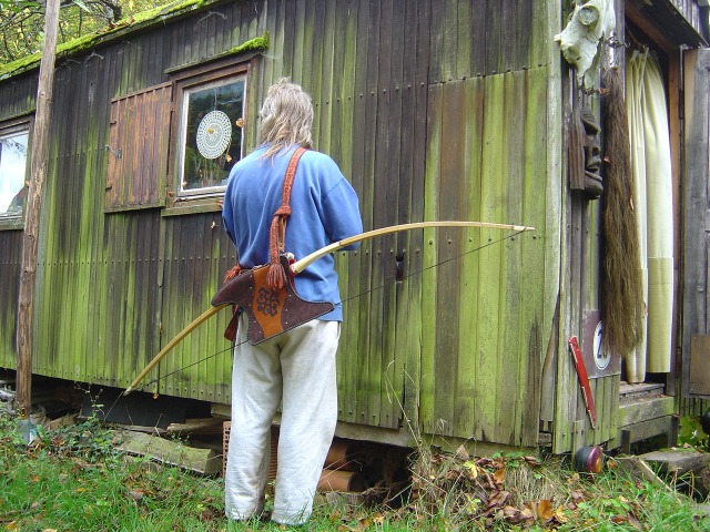 der Bogen hält durch die Form des Köchers, das läßt sich an den Löchern für die Nähte leicht anpassen... natürlich bleibt ein Langbogen lang....
