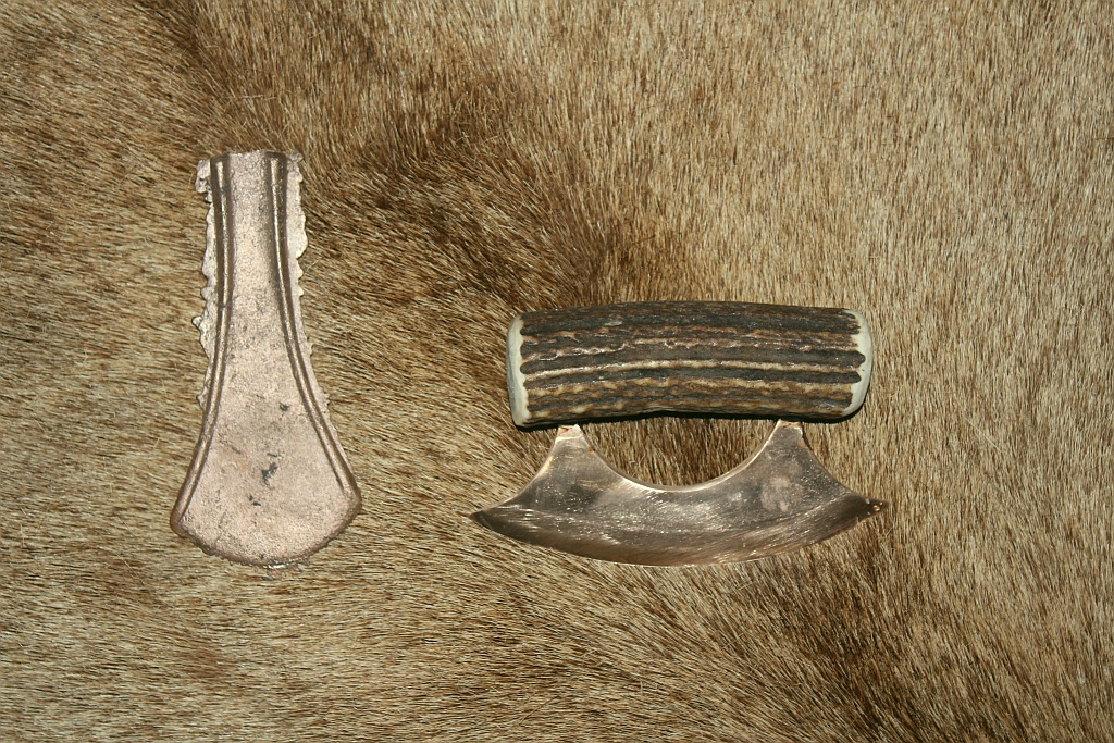 Diesmal sollte es ein Schaber (auch als Wiegemesser zu benutzen) und ein Randleistenbeil aus der frühen Bronzezeit werden.Beim Randleistenbeil habe ich mich an archäologische Funde gehalten.
