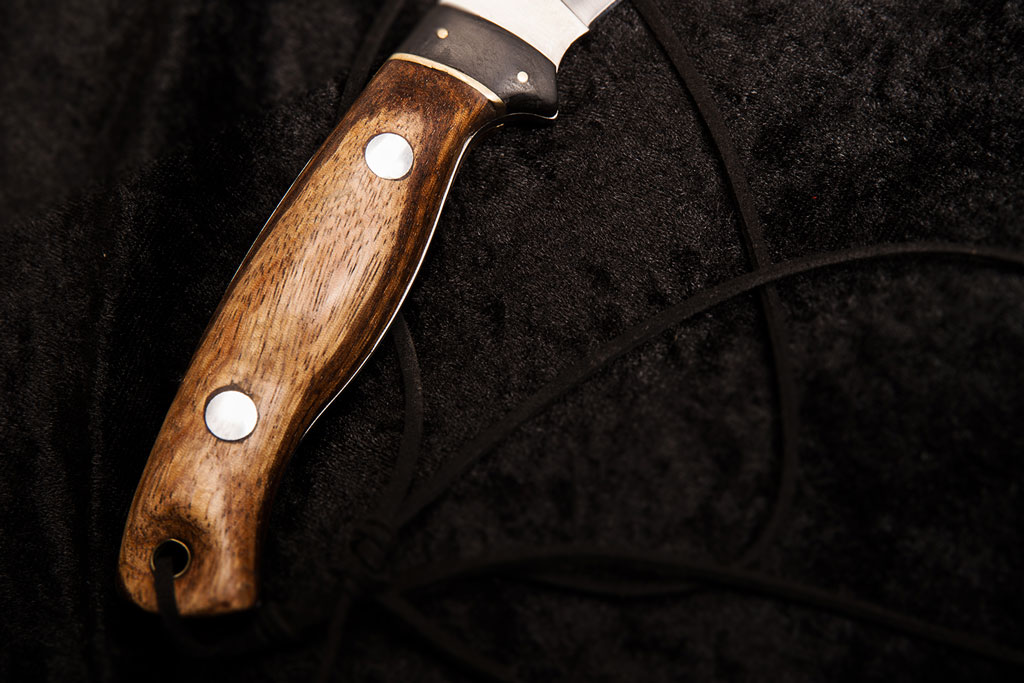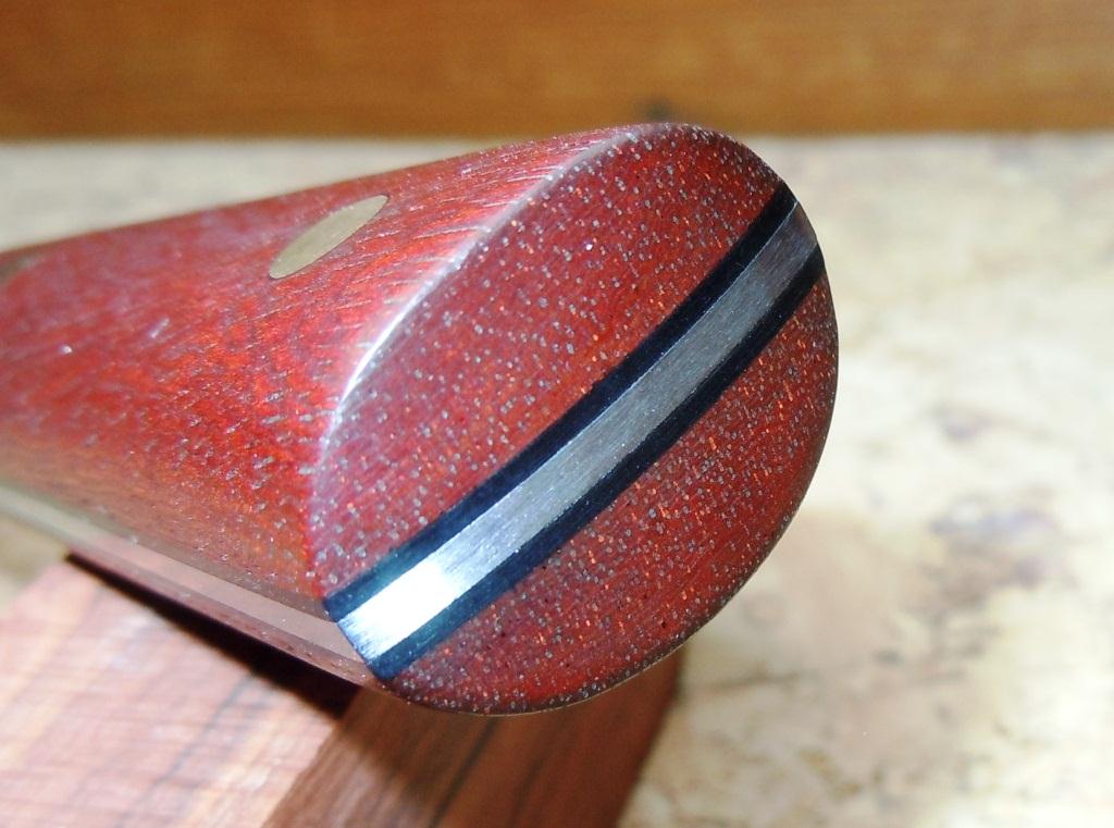 Griff: das Holz hab ich von meinem Freund aus Brasilien. Er hat keine Ahnung was es ist und somit ich auch nicht. Es ist kein Hartholz und der Staub färbt alles Rot. (Ich habe noch was von dem Holz und muss mal probieren ob ich mit dem Staub färben kann) dazu schwarzes Fiber, Messingnieten und Micropin.