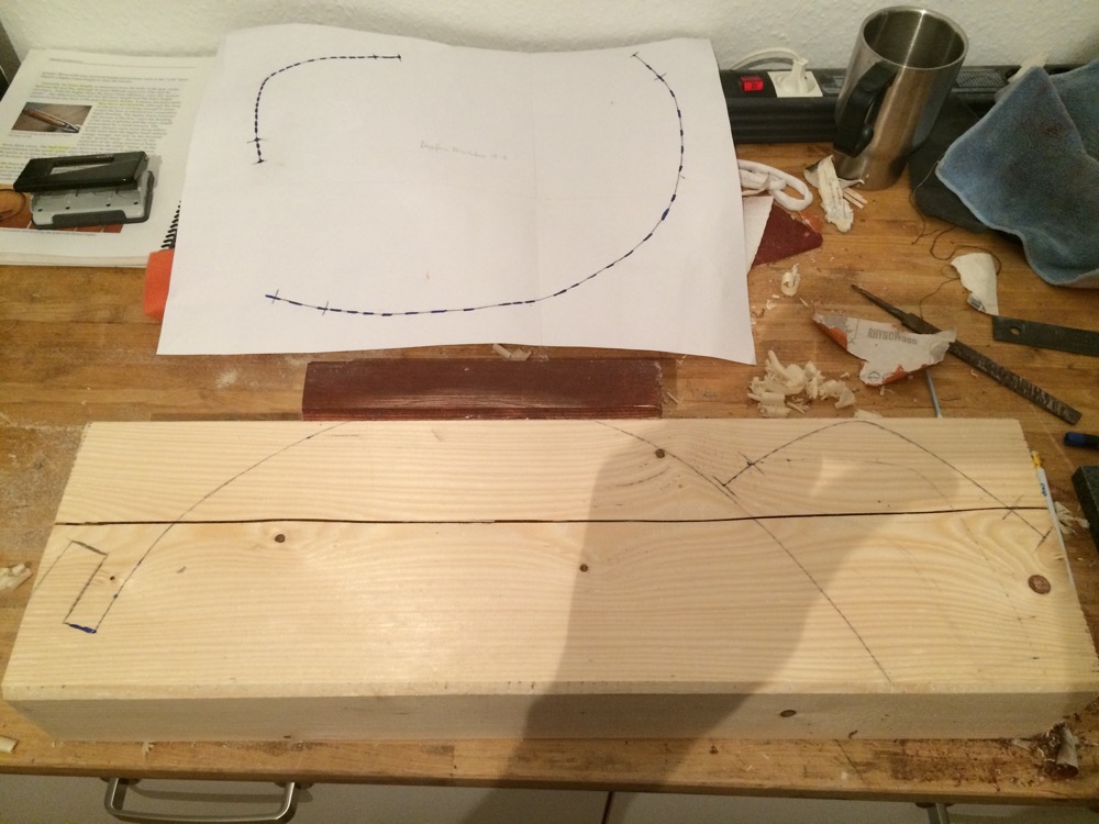 Worüber ich mir noch keine Gedanken gemacht habe, ist der Griff. Da der einigermaßen gerade ist, dann aber gleich in Reflex übergeht, müsste ich hier wohl auch nochmal auf einer Biegeform rumdenken...